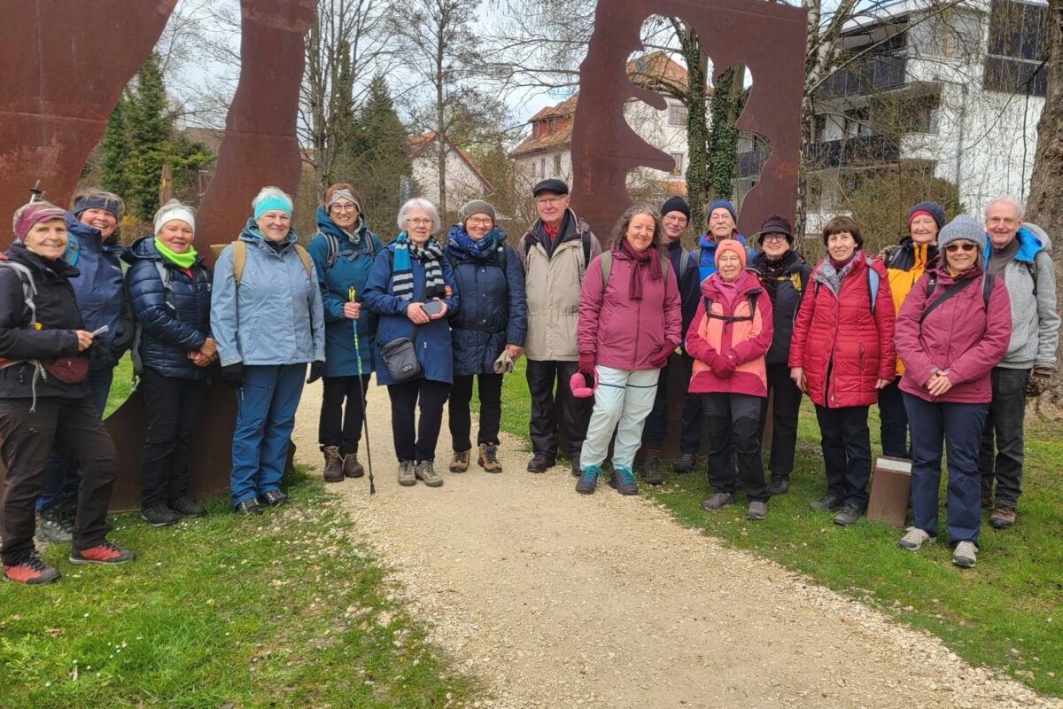 Und so machten sich 19 Wanderer trotz ungünstigster Wetterprognose (Schnee, Kälte, Sturm) am Donnerstag, den 26. März auf den Weg zum Rosenegg. Gerüstet mit Schirm und Regenkleidung ging es nach Zug- und Busfahrt (Linie 402 nach Rielasingen) auf der roten Wanderroute im Zick-Zack den steilen Anstieg hinauf.