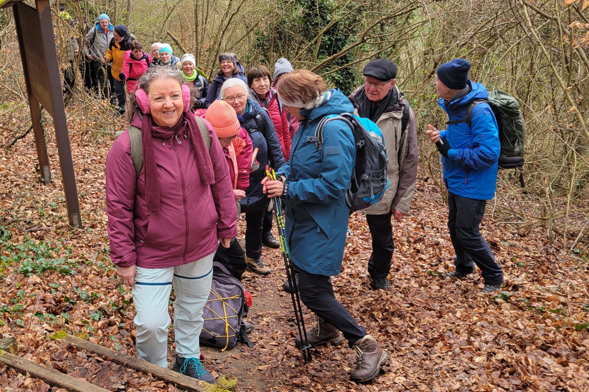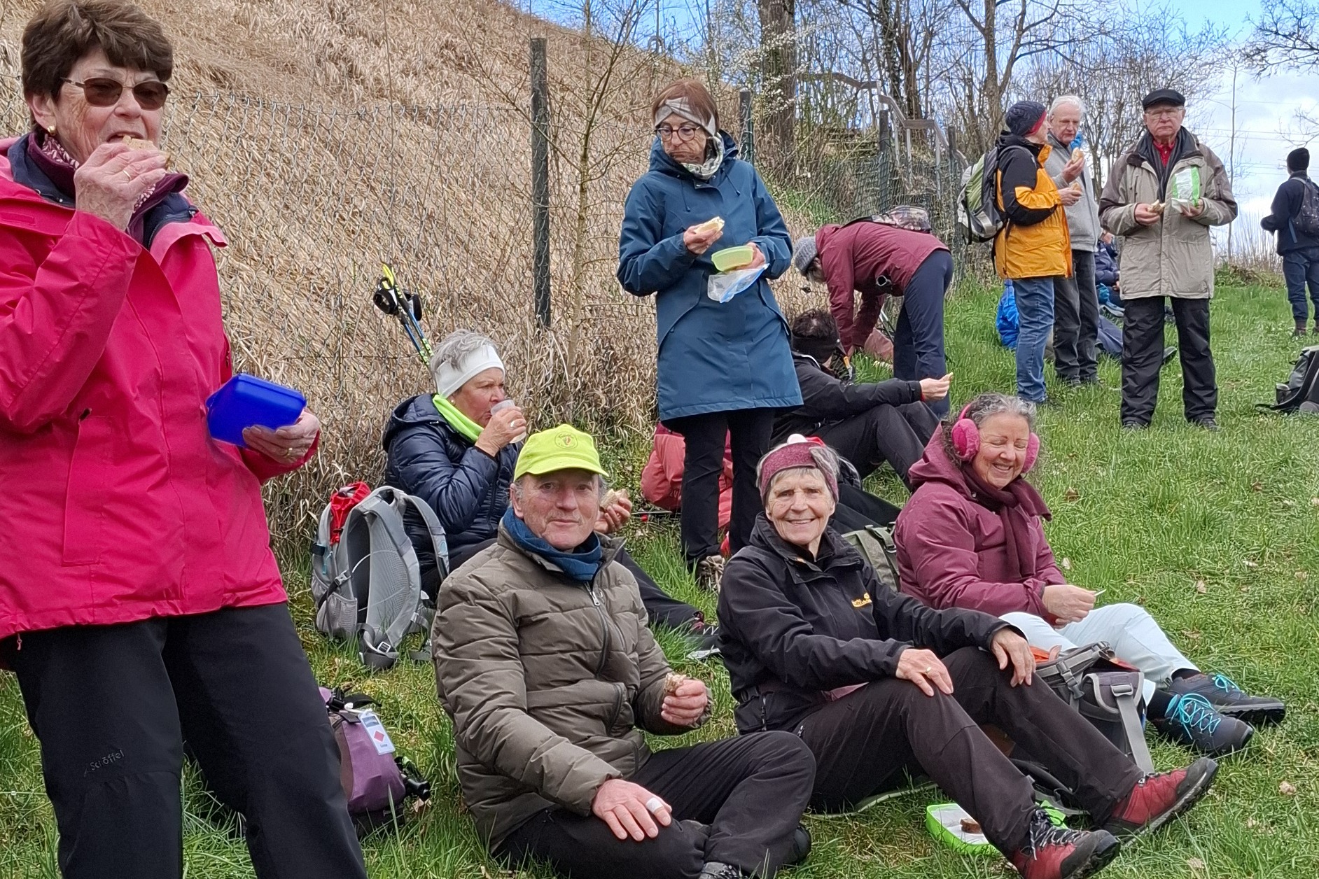 Und so machten sich 19 Wanderer trotz ungünstigster Wetterprognose (Schnee, Kälte, Sturm) am Donnerstag, den 26. März auf den Weg zum Rosenegg. Gerüstet mit Schirm und Regenkleidung ging es nach Zug- und Busfahrt (Linie 402 nach Rielasingen) auf der roten Wanderroute im Zick-Zack den steilen Anstieg hinauf.
