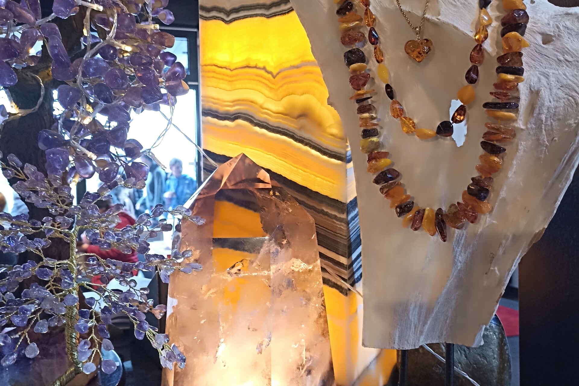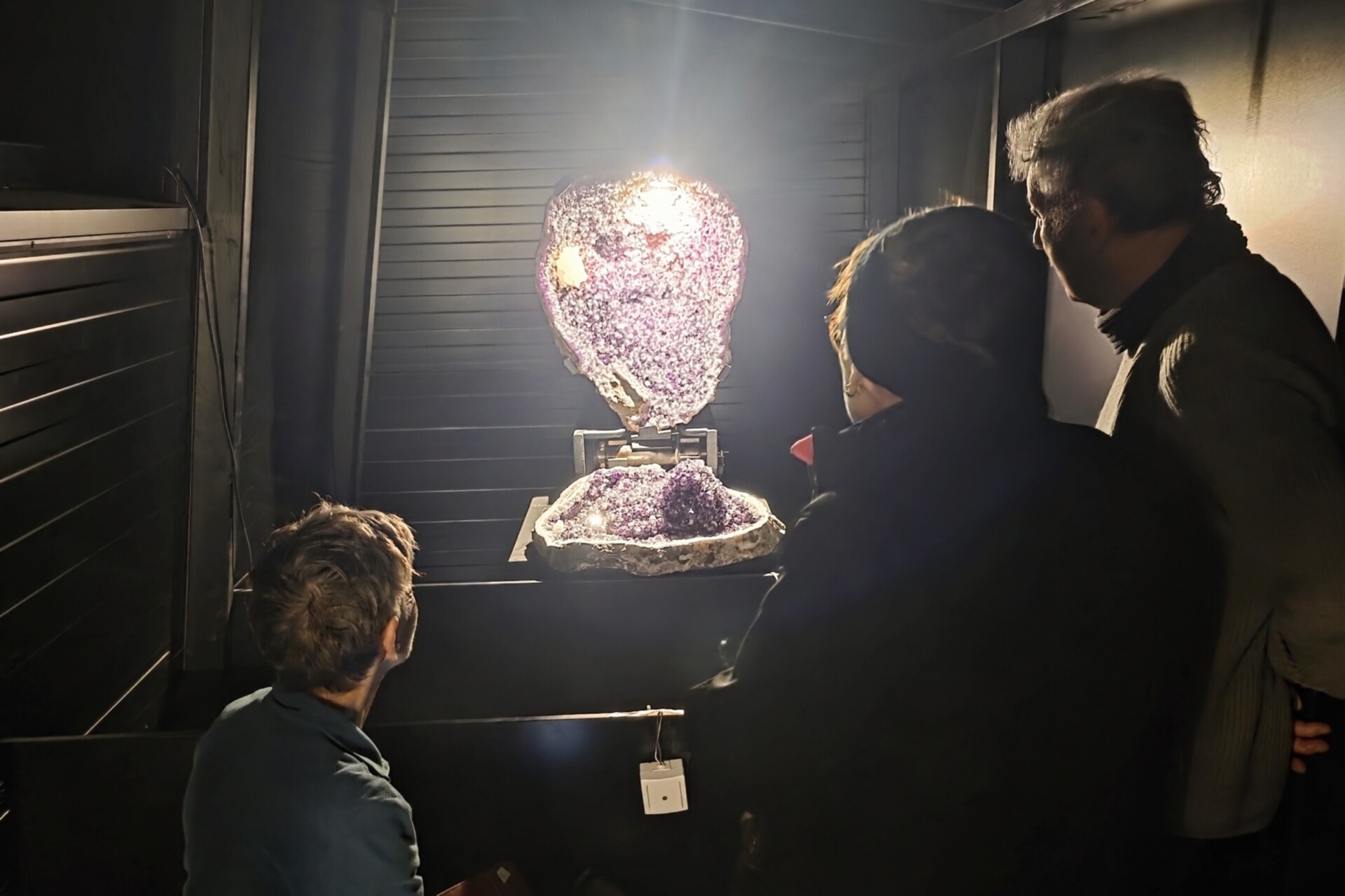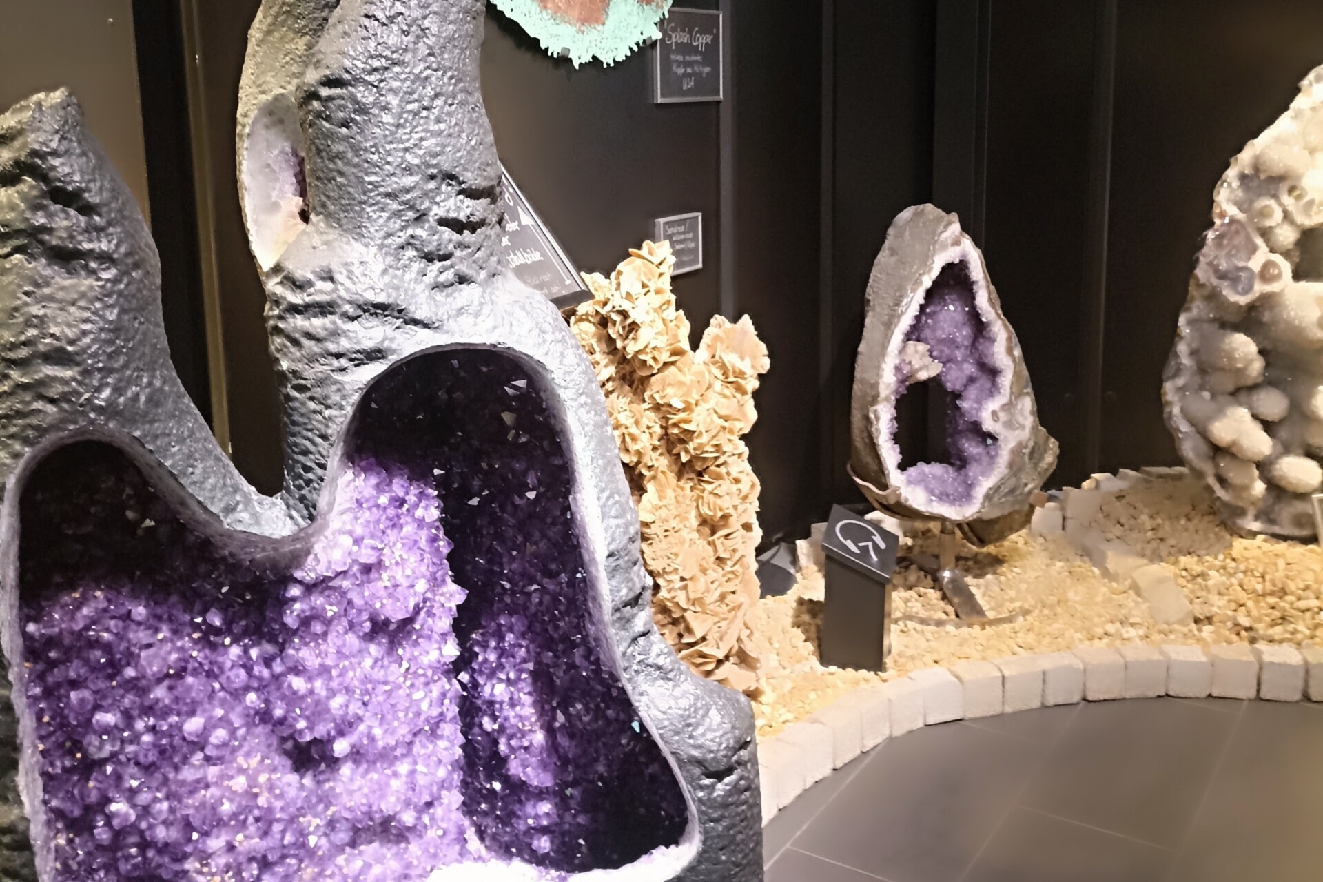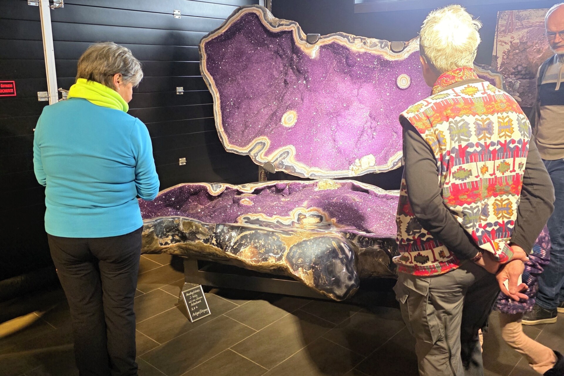 Und endlich wurde unsere Geduld und Entschlossenheit köstlich belohnt. Wir erreichten das Museum „Welt der Kristalle“. Wundervoll sehen gigantische Steine mit Drusen und Kristallen aus, zahlreiche Fossilien erregen heftiges Interesse. Die Schönheit der Natur begeistert und raubt den Atem. Alle haben viele unvergessliche Fotos gemacht. Man konnte auch einen spannenden Film über die Geschichte, Geographie, Geologie und Paläontologie sehen. Für ein paar Euro dürfte man sich einen unscheinbaren Stein knacken lassen, welcher dann die unerwartete Schönheit im Inneren entdeckte. Jemand hat sich schönen Schmuck aus Halbedelsteinen gekauft.