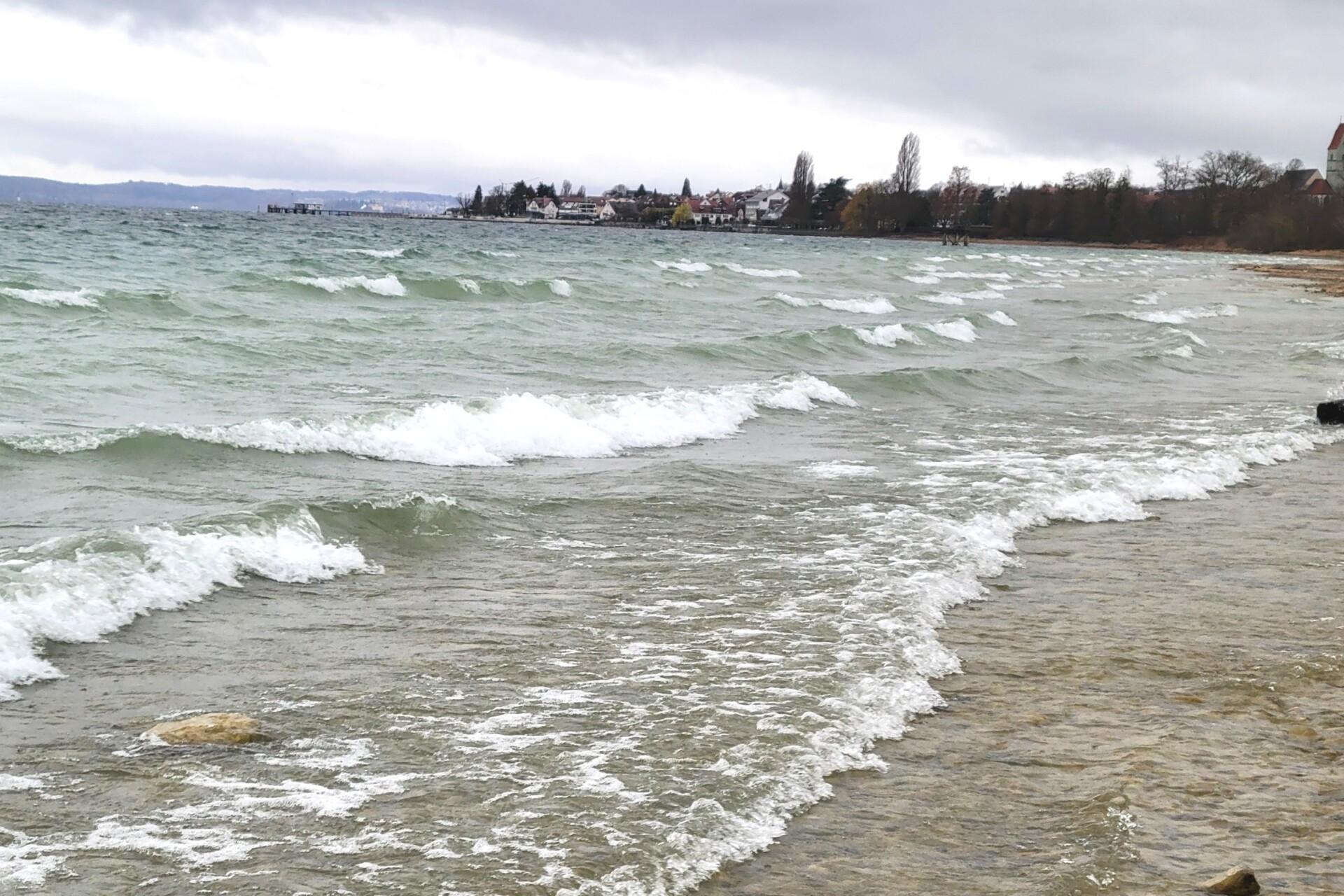 Nach einer guten Stunde pausieren wir auf einem großflächigen Wiesengelände mit mehreren Bänken, um uns die mitgebrachte Brotzeit munden zu lassen. Dabei sind wir auch noch einem von der See her starken Seitenwind ausgesetzt, der die anrollenden Wellen, teilweise sogar mit Schaumkronen, heftig an das Ufer spült. Nur durch die Wahrnehmung einer vorhandenen Deckung in Form einer ca. 2 Meter breiten hölzernen Kletterwand konnte man diesen Böen einigermaßen für eine kurze Zeit widerstehen! Gut gestärkt sind wir mit schnellen Schritten im idyllischen Fischer- und Winzerdorf Hagnau angelangt, das wir zügig durchqueren. Auf dem nun folgenden Höhenweg kommen wir auch an der Kriegsgräber- und Gedenkstätte Lerchenberg vorbei, wo 69 deutsche Kriegstote des Ersten Weltkrieges ruhen. Außerdem bietet sich uns von dort eine spektakuläre Sicht auf den derzeit aufgewühlten See und den Blick nach rechts wendend auf unser Wanderziel Meersburg an, durch das wir nach einer guten halben Stunde innerhalb der historischen Oberstadt flanierend die „Gutsschänke“ zu einer geselligen Schlusseinkehr mit Kaffee und Kuchen in mittelalterlicher Nachbarschaft von Burg und Schloss aufsuchen.