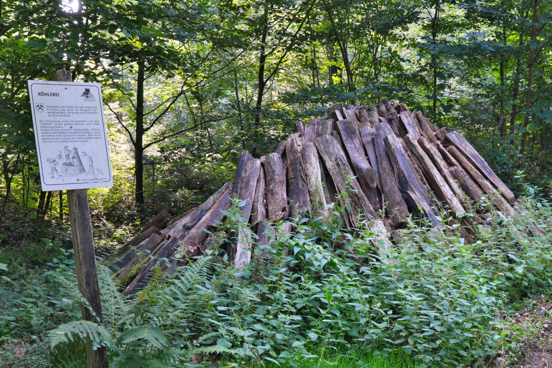 Die Burg Husen, stolzes Wahrzeichen Hausachs, grüßte von ihrem Felsen herab, während wir sie linkerhand liegen ließen. Kurz darauf trafen wir auf einen nachgebauten Kohlenmeiler, der an die harte Arbeit der Köhler erinnert: Für den Silbererzabbau wurden Unmengen Holzkohle benötigt – eine mühsame, schweißtreibende Tätigkeit, die im Schwarzwald eine lange Tradition hatte.