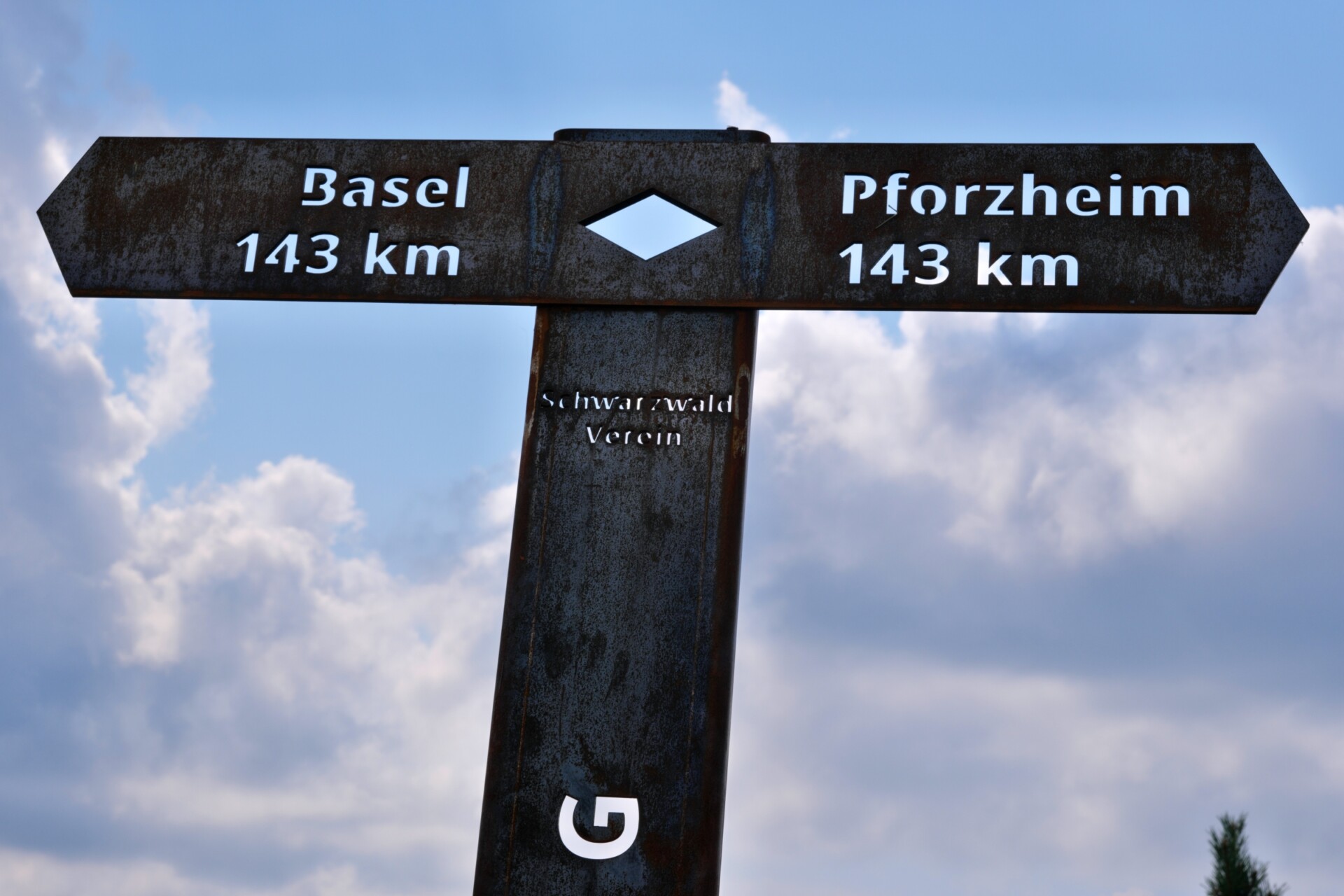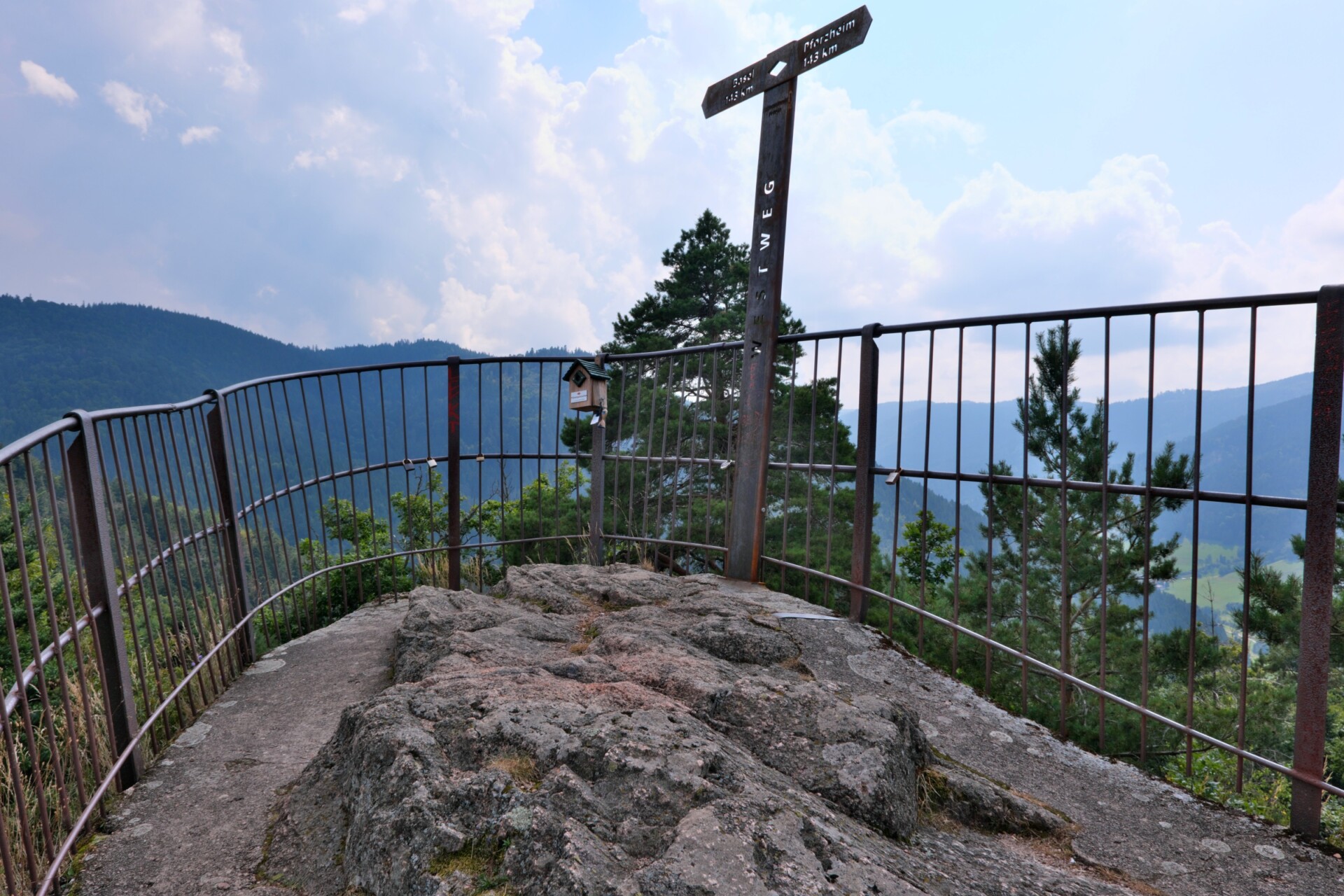 Auf dem Abstieg erreichten wir den markanten Huberfelsen. Seine Silhouette erinnert an den Bug eines U-Boots und markiert zugleich die Hälfte des gesamten Westwegs von Pforzheim nach Basel (143 km). Für uns war an diesem Tag schon einiges geschafft: 12,3 km hatten wir in den Beinen – mehr als die ursprünglich angekündigte Gesamtstrecke. Doch mit nur noch sieben Kilometern bis Hornberg lag das Ziel greifbar nahe.